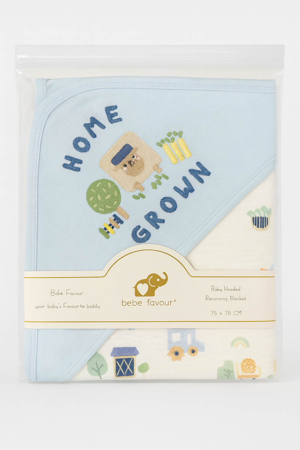 Nurture your baby with love and warmth using the Bebe Favour “Home Grown” Hooded Receiving Blanket. Made from super-soft, breathable fabric, this adorable blue blanket features a cute garden-themed embroidery and playful farm prints. It’s perfect for cuddling, swaddling, or post-bath snuggles, keeping your little one cozy and happy all day.