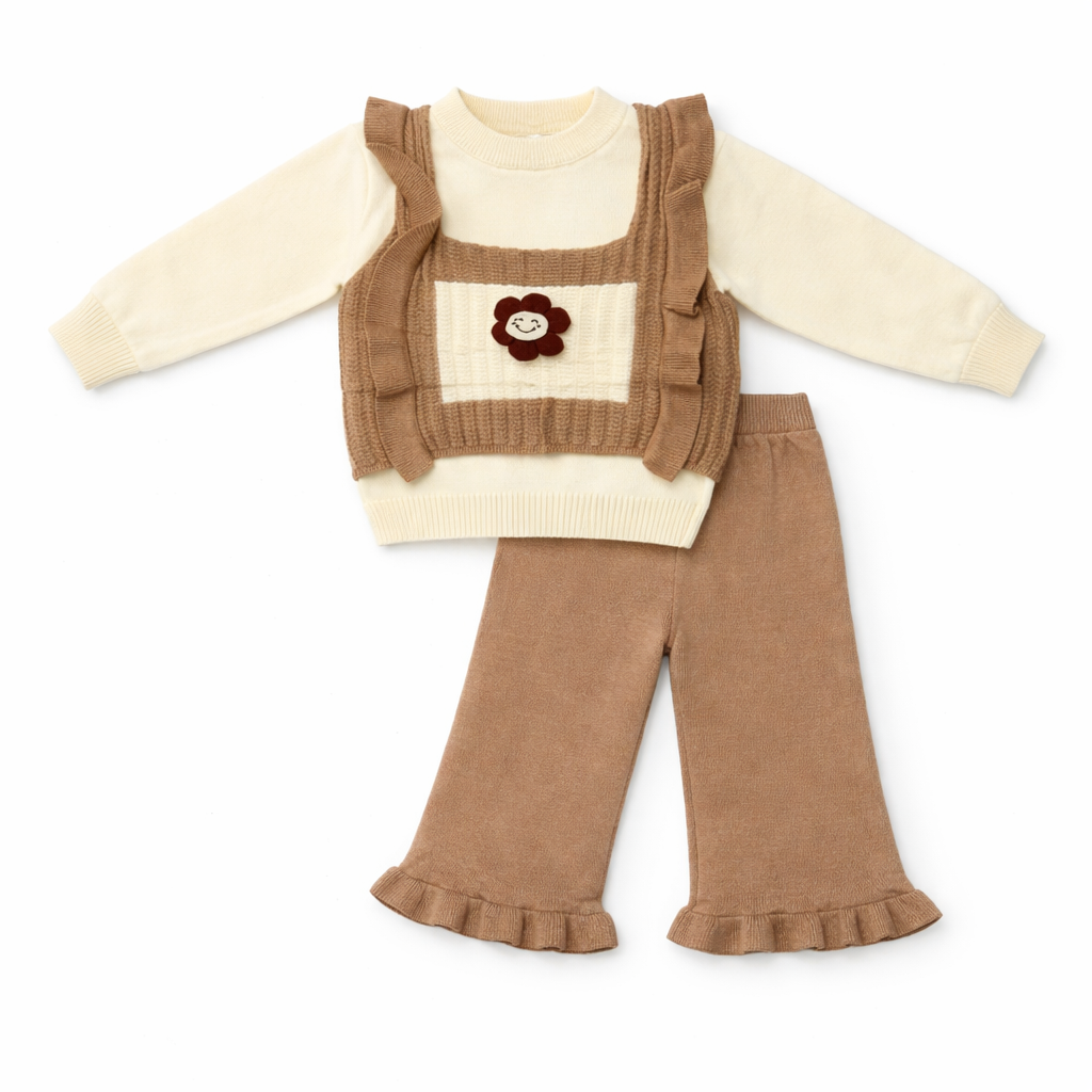 Keep your little one warm and stylish with this beautiful brown and cream knitted baby outfit, designed with a soft layered-look top and a charming floral patch detail. Paired with matching pants featuring delicate ruffle hems, this set offers both comfort and timeless style for winter days.