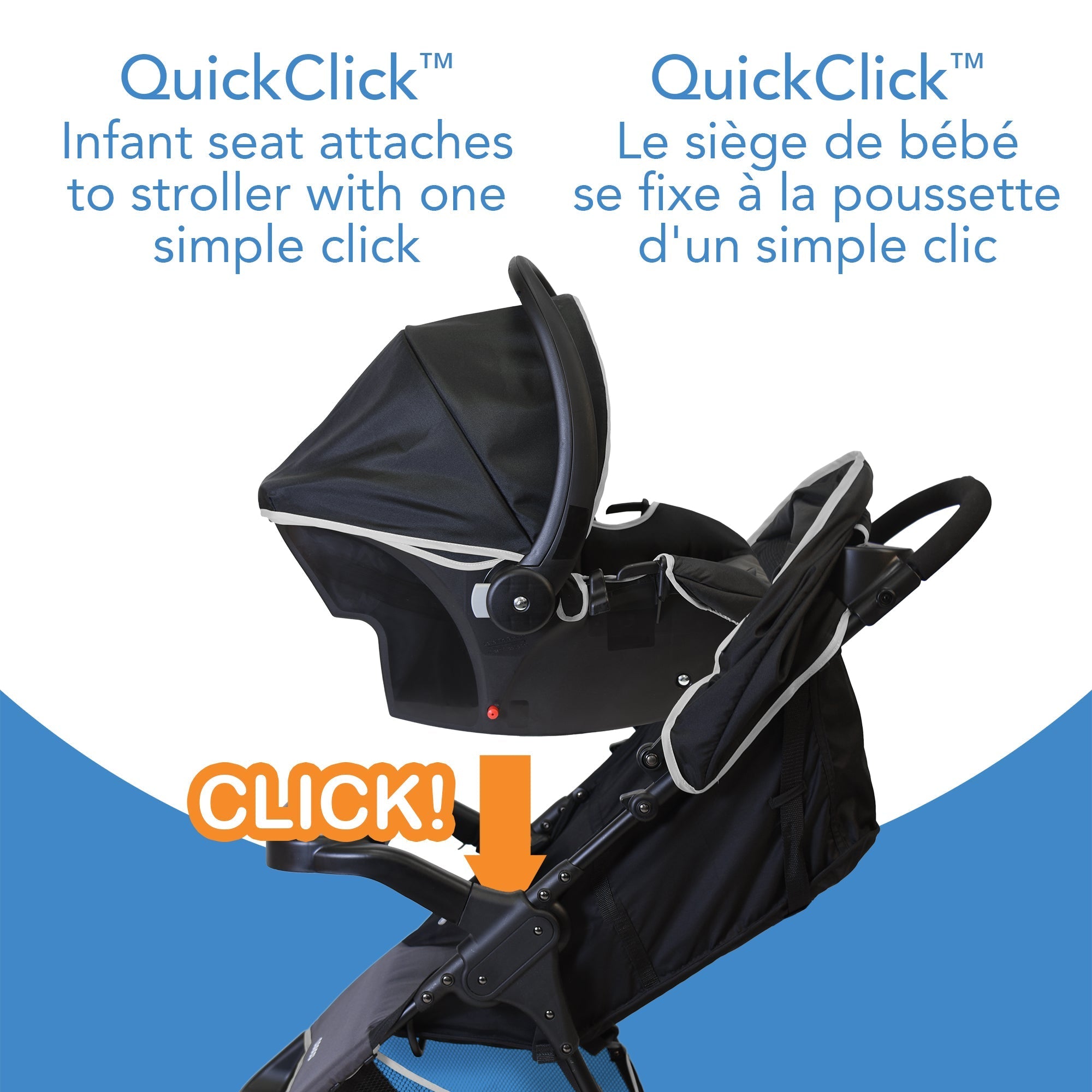 • QuickClick™: Infant seat attaches to stroller with one simple click