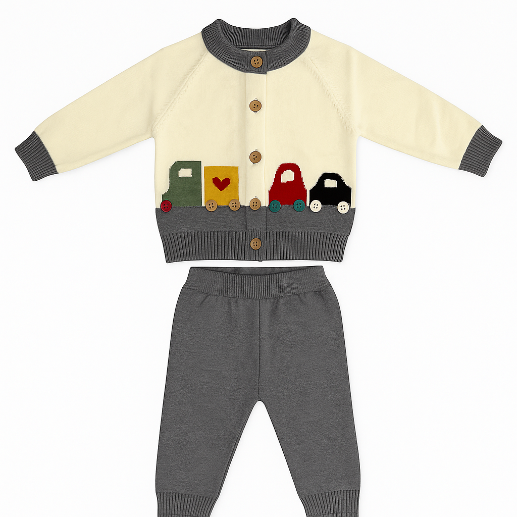 Cream & Grey Car Knitted Baby Set – Playful 2-Piece Winter Outfit
