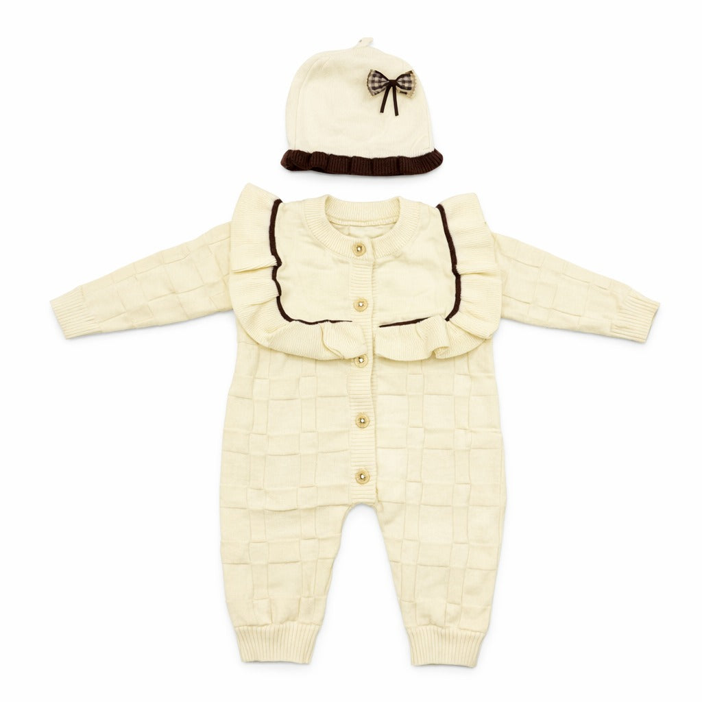 Wrap your little one in cozy elegance with this beautiful cream knitted romper set, designed with a soft ruffle cape and a matching cap adorned with a cute bow. Crafted from warm, gentle winter knit fabric, this outfit is perfect for keeping your baby comfortable and stylish during colder days.