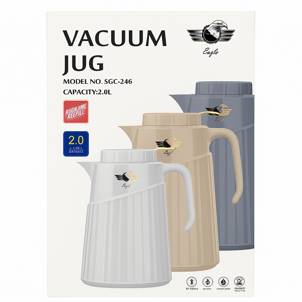 Keep your drinks at the perfect temperature with the Eagle 2.0 Liter Vacuum Jug (Model SGC-246). Designed with a stylish ribbed body and ergonomic handle, this jug combines modern aesthetics with long-lasting temperature retention. Perfect for tea, coffee, milk, kehwa, and chilled drinks, whether at home, office, gatherings, or dawat setups.