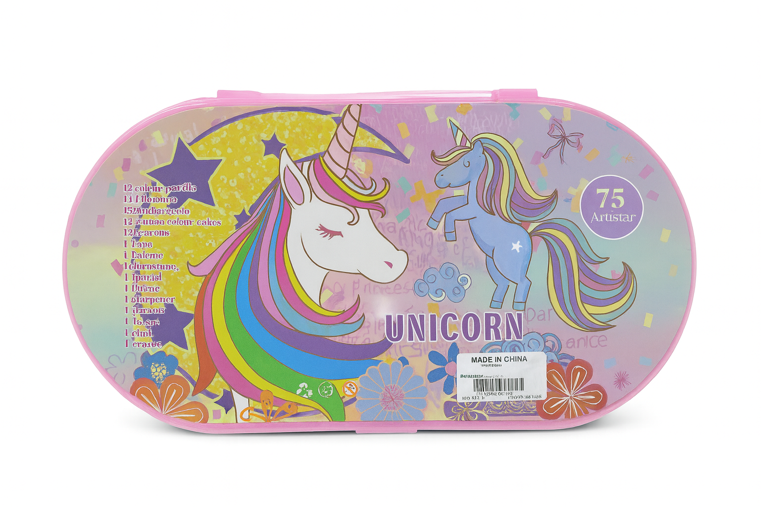 Let your child’s creativity shine with this Unicorn 75-Piece Art Set, beautifully packed in a pink unicorn-themed case. This all-in-one art kit includes everything young artists need — crayons, markers, watercolor paints, pencils, tools, and more. With vibrant unicorn graphics and organized compartments, it’s perfect for school projects, home creativity, and gifting.