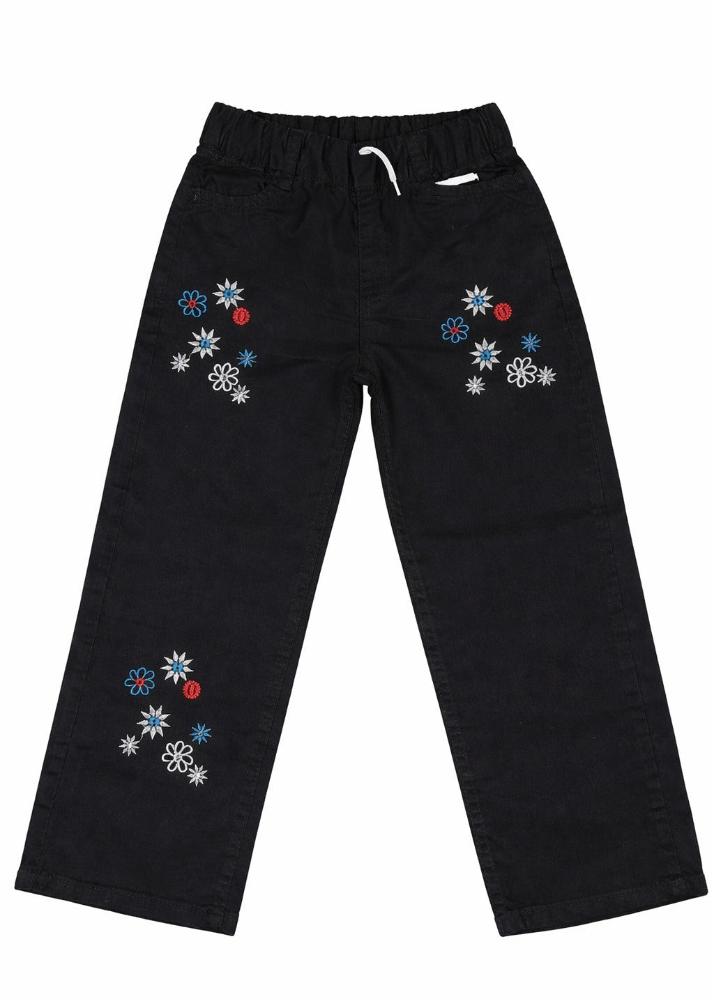 Girls Black Straight Pants – Floral Embroidered with Elastic Waist & Drawstring