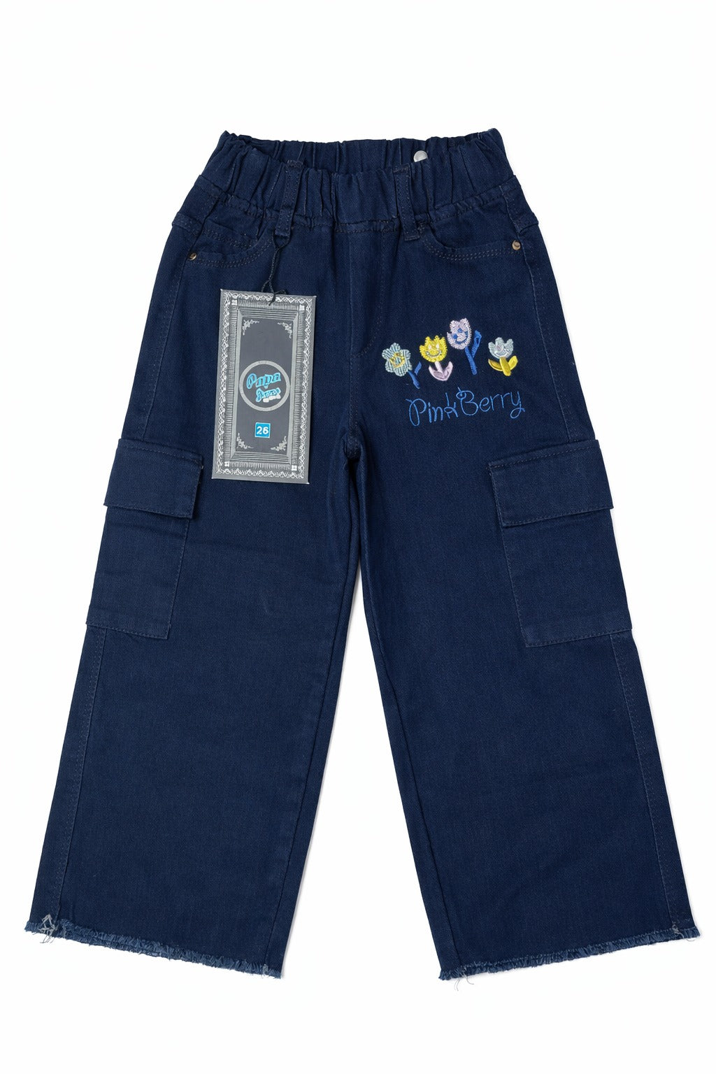 Girls Navy Blue Cargo Pants – Wide Leg Fit with Floral Embroidery (Pink Berry)