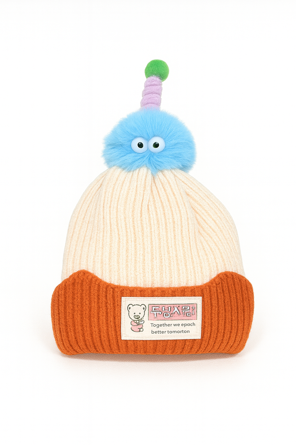 Cute Blue Pom Pom Kids Winter Beanie – Cream & Orange Knit Hat with Fun Eyes