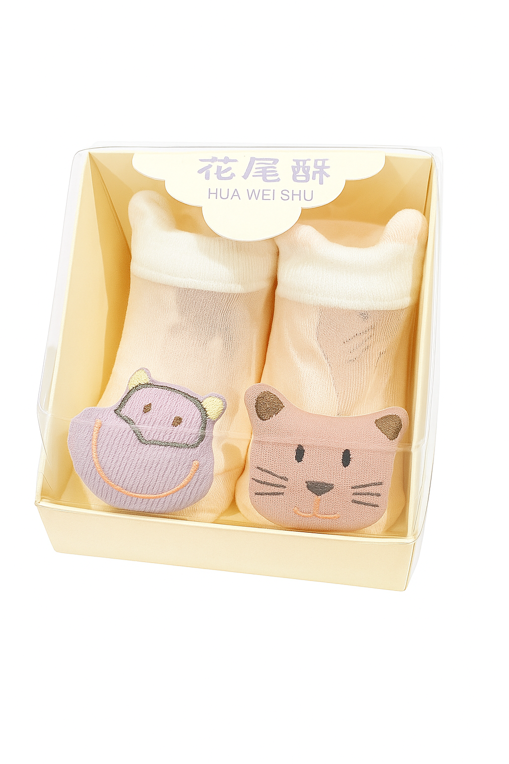 HUA WEI SHU Baby Socks Gift Box – Soft Cotton Mesh Booties with Cute Animal Faces (Beige & Cream)