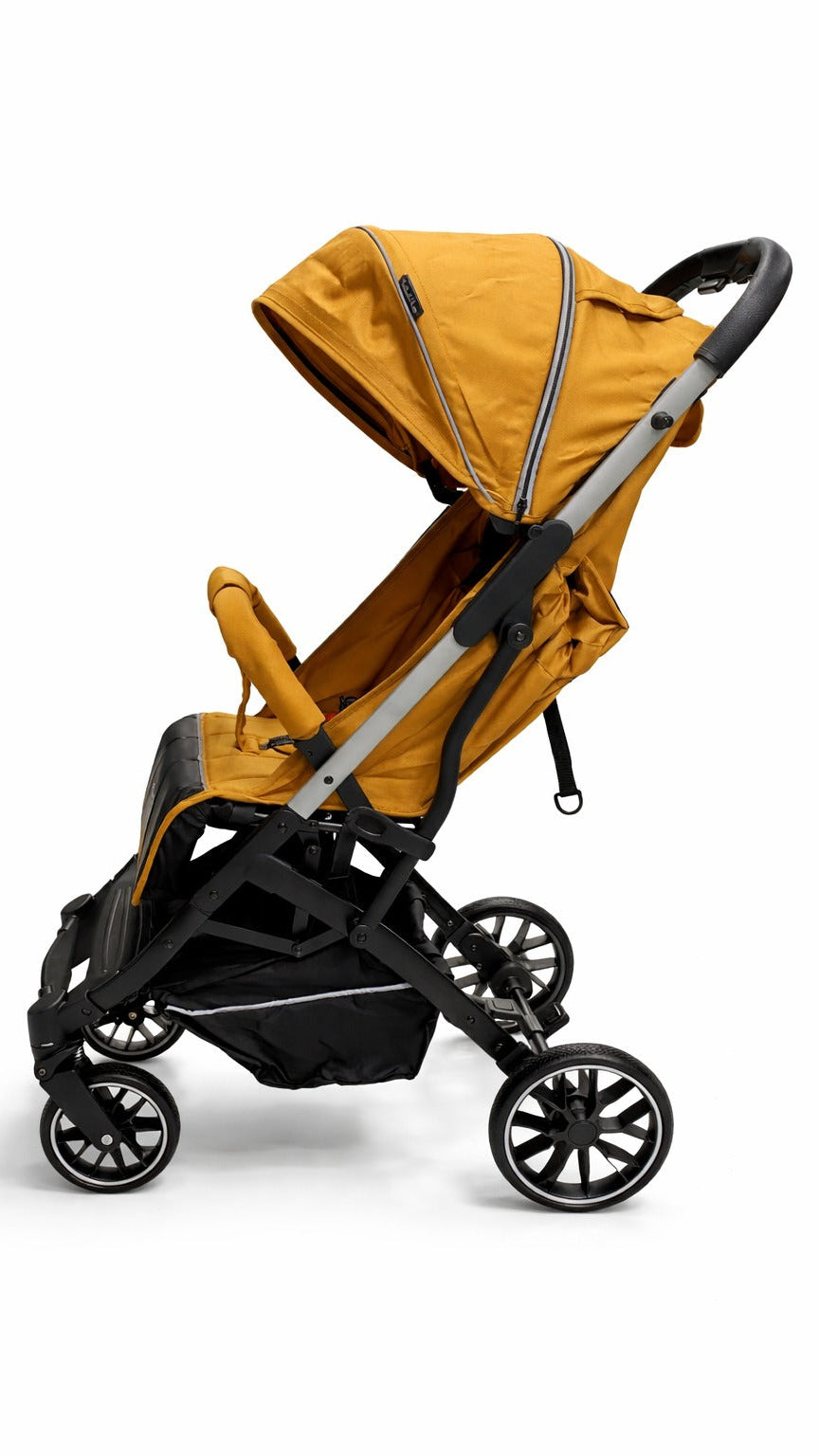 The Kidilo Baby Stroller is thoughtfully designed to provide comfort, safety, and convenience for both parents and little ones. Featuring a stylish mustard yellow fabric with a modern black frame, this stroller stands out while remaining practical for everyday use.