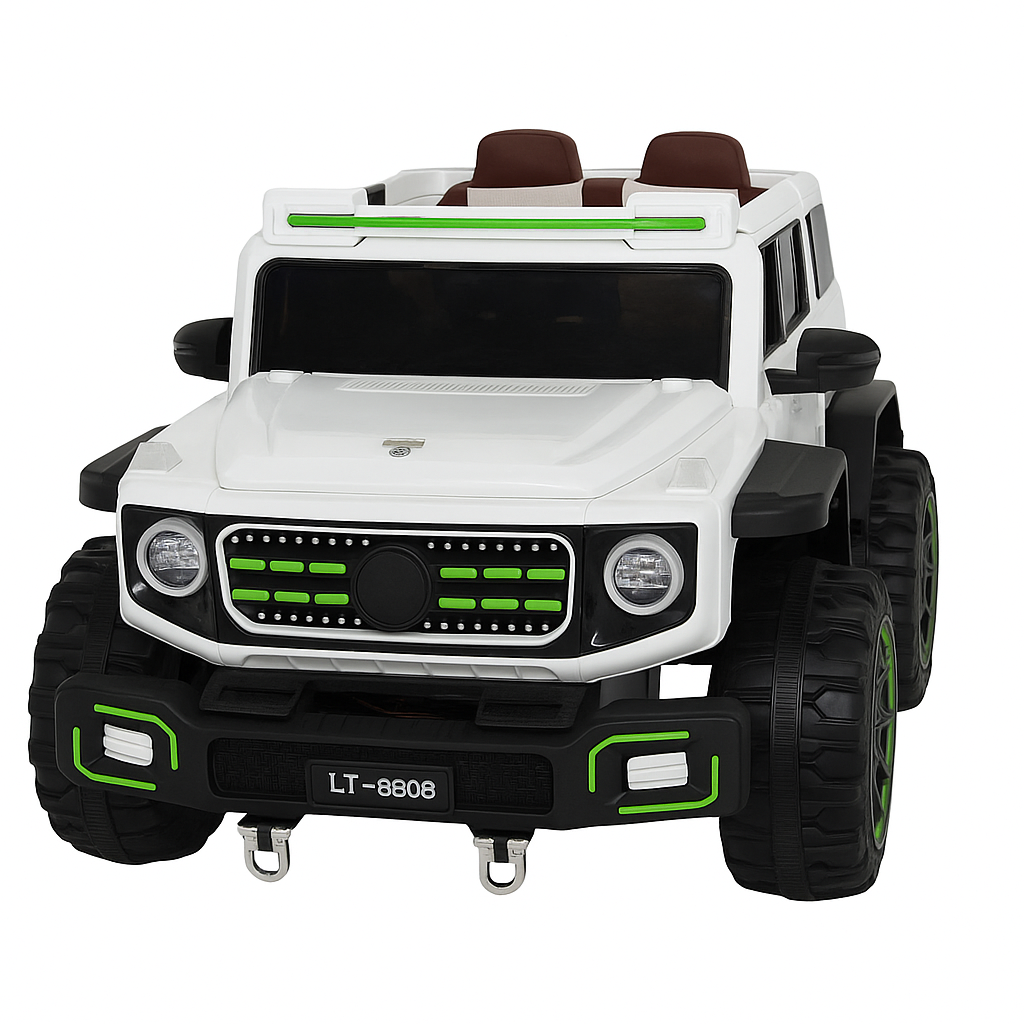 Let your little champ ride in style with this powerful LT-8808 Ride-On Jeep! Designed with a premium white & neon-green sporty look, this electric jeep is perfect for adventurous kids who love outdoor fun. With a 12V rechargeable battery, realistic LED front lights, music system, horn, and soft-start driving, it's built to give a real jeep experience.