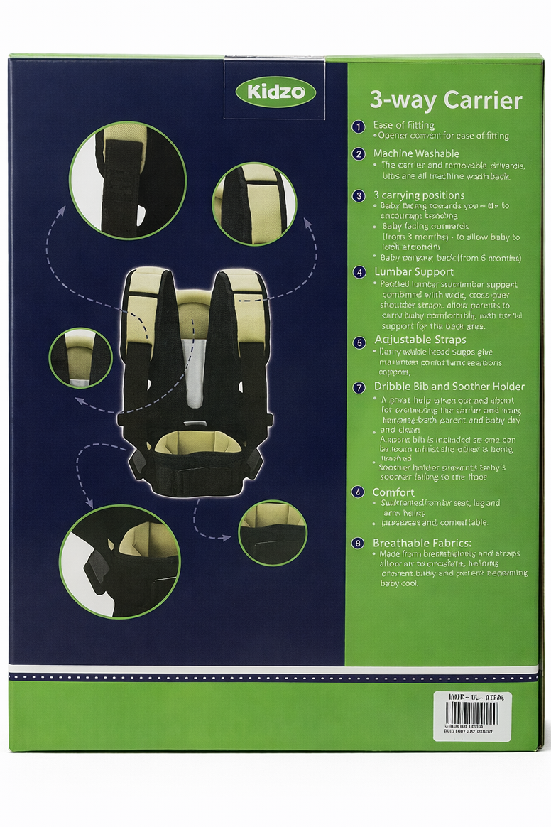 Make carrying your baby easy, safe, and comfortable with the Kidzo 3-Way Baby Carrier. This premium carrier is designed for parents who want flexibility and comfort, offering 3 different carrying positions as your baby grows.