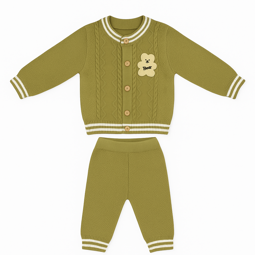 Olive Green “Best Bear” Knitted Baby Set – Button-Up Cozy Outfit