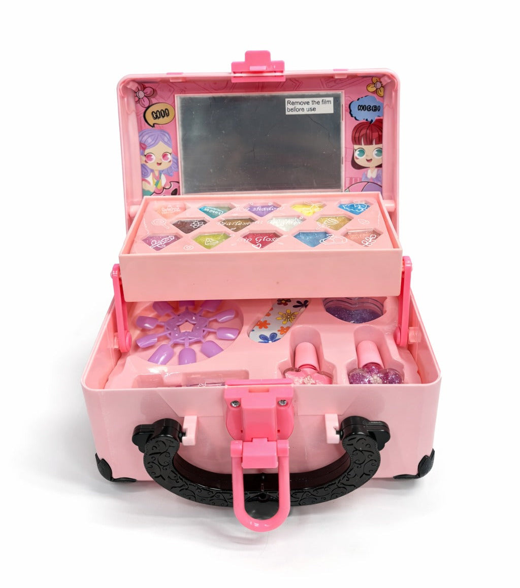 Perfect for role play, creativity, and confidence-building, this toy makeup box includes play lipstick, nail accessories, eyeshadow-style colors, and fun tools — all neatly organized inside a sturdy, portable case. The compact design with a secure latch and handle makes it easy to carry anywhere, whether at home or on the go.