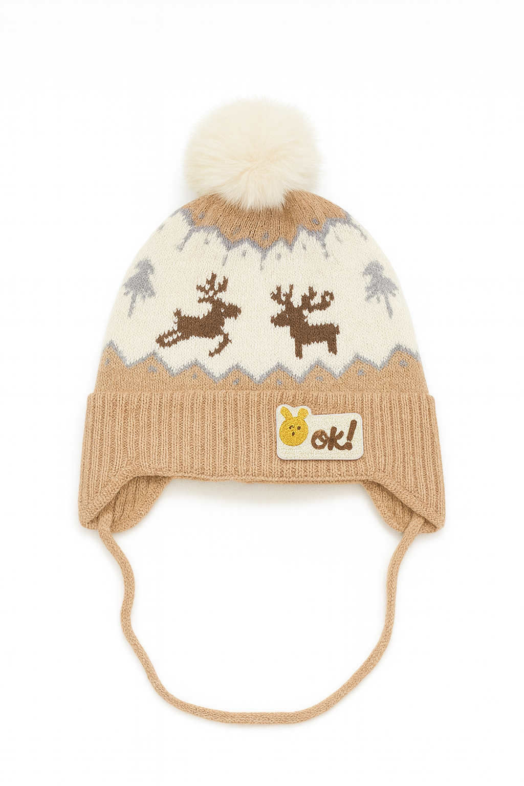 Cute Reindeer Knit Baby Winter Hat with Pom Pom & Ear Flaps – Soft Warm Beanie for Toddlers