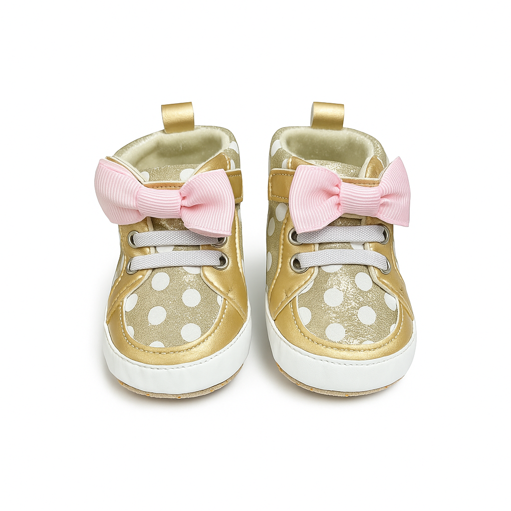 Golden Polka Dot Baby Shoes with Pink Bow ā Sparkly & Sweet