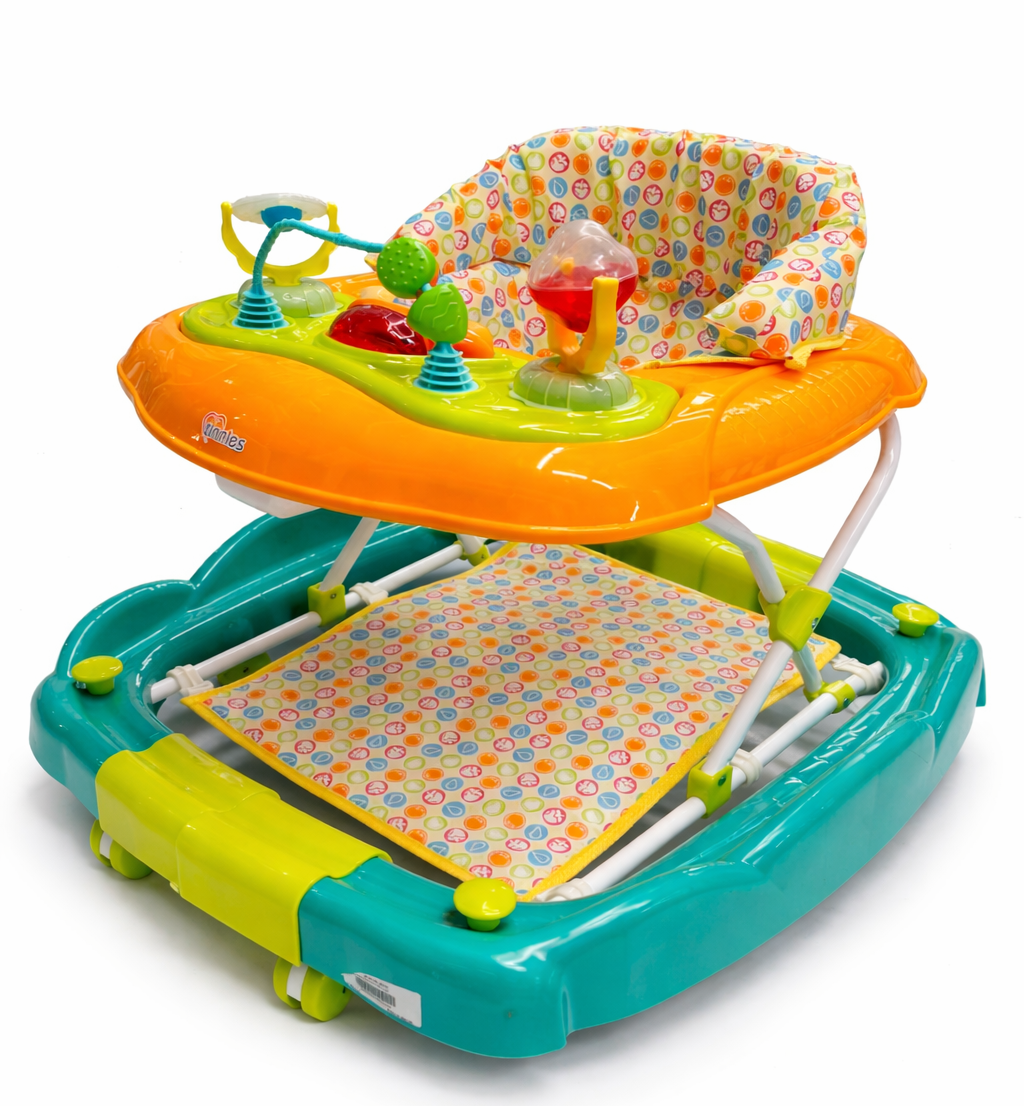 Bring joy and excitement to your baby’s first steps with the Tinies Fun Activity Baby Walker. Designed in a bright orange and green color combination, this walker features an interactive activity tray with colorful spinning toys, rattles, and fun shapes to keep your little one entertained. The soft, patterned cushioned seat provides comfort and proper support, while the sturdy wide-base frame ensures stability and safety as your baby moves around. Smooth-rolling wheels allow easy movement on different floor surfaces, helping build confidence and motor skills. Perfect for playful learning and early walking development, this baby walker is a great choice for growing toddlers.